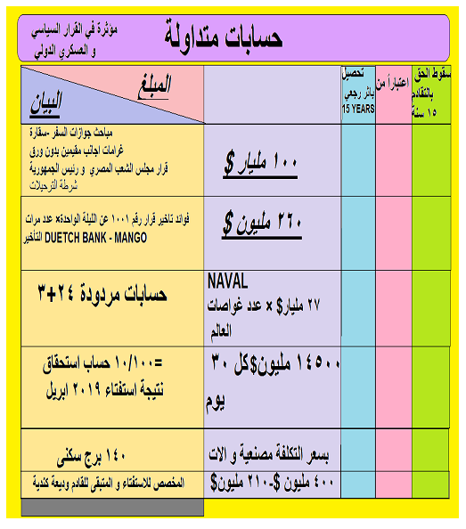 (1): “After the loss(STOLEN FROM AL- TAHRIR SQUEAR) of the Egyptian CENTRAL Bank Printing Press(FIRST ONE) near by (100feets)the Egyptian House of Representatives – Al-Qasr Al-Aini Street and Tahrir Square -( and I was contracting with the Egyptian government in a similar way to my work with the US government.)and the blocking of the declaration T.V monitor camera man -In the recorded in the births of Egypt -of different ages, etc.,-of the citizen by his daily share of this giant printing press of the Egyptian banknote- was killed by the gun of Bab-Sharki- Alexandria senator , inside the Egyptian House of Representatives. A new one (THE SECOND ONE)was established in South Marsa-Matrouh -west of Alexandria city,but its warehous was in Al-Ajamy west of Alexandria,surrounded by {CENTRAL BANK OF EGYPT}’ EMPLOYEE AND THIER FAMILIES , in 22 buildings,440 flats, huge garage, And the mentioned warehouse.(1)-Mr/Biden was the night guard(2)-Mr/ shemoon peres was the day gurd (3)-Mr/ Abdelfata El-Sisi -The Egyptian president-2014-till now-(Because he had enough experince in warehouse banknots-before- in Qabbary Police Station with his friend the poem/ Hesham Algokh.(4)-Mr/Ireel Sharoon hurried to Aswan to put ABOTTLE OF PURE OLIVE OIL IN HIGH DAME TOURBINE HOUSE- TO AVOID Rumors of hostility to the livelihood of the Egyptian people.While The UNION SOVIET DECLARE THAT HIGH-DAME WAS BUILT BY RUSSIAN LOAN TO EGYPT AND PAYMENT IN THE NEXT The next decade. By method of pay or!! Or What? as White House/Ukranian payment $%.Meanwhile (5)Mr/Pence -vice president was the Engineer of The only nuclear missile. under ground in 6 October City east of Cairo the capital. Operate stand by 3 catredge(keys) one of them was with me-getting off it in space while mywork journey to operate the Internet ,etc.(6)Mr/ president Donald Trump was the manager of [Bad Boys Military school]and others, in south west of London.*This never arrive to it under ground-which its heads were replaced with woody heads ,after the area became full of civil, children and babies gardens,etc.- exept for , from the hospital of El-Abbasya underground across long channel by jeep. branches into many ,one of them to” Inshase ” military base and Air forces.(7) Accusing the Public Prosecution,(8) the Military Intelligence,(9) and the Washington Post of cooperating in% commission and damaging the citizen’s mind. Since the day of the discovery of intelligence – financial crime – until the defendant’s presentation to the public prosecutor is perfect and perfect 1001 days (3 years), while the Washington Post innovates in filling the minds of students and citizens with logical reasons based on what they studied and what is being repeated as national and national postulates. The period proved – accurately – that it generates a profit of 26% (10) in Dutech Bank of the amount (financial crime) until the day of his innocence or imprisonment or imprisonment from leaving the hall “Judiciary” .EQUALITY FIRST ..THEN DESERVING(TRIBES )
